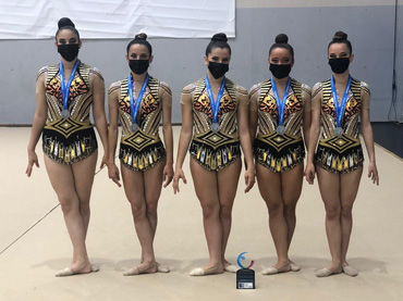 Para finalizar el conjunto juvenil base formado por Candela,Mirian,Alba,Paula y Carmen realizaban un ejercicio de cuerdas y aros logrando subirse al segundo peldaño del podium proclamándose subcampeonas de Andalucía Base.